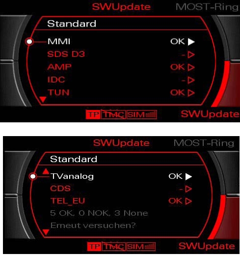 Просмотрите весь список блоков, и, если есть блоки, где перепрограммирование прошло неудачно или со сбоем (будет помечено рядом с блоком NotOK), то выбирите пункт "Erneut versuchen?" и повторите процесс, пока напротив всех блоков не будет стоять ОК. Если все блоки помечены ОК, то опустите курсор в самый низ и с помощью центральной клавиши перезапусте MMI: