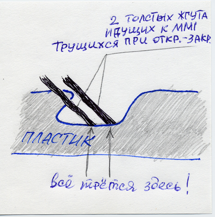 Подтянули провода (там два толстых жгута в тряпчаной оплётке),и эта оплётка вся истрёпана и собрана в гармошку именно в тех местах где происходит трение о пластик (попытался нарисовать,сфотать не получилось потому как руки были заняты подсветкой).