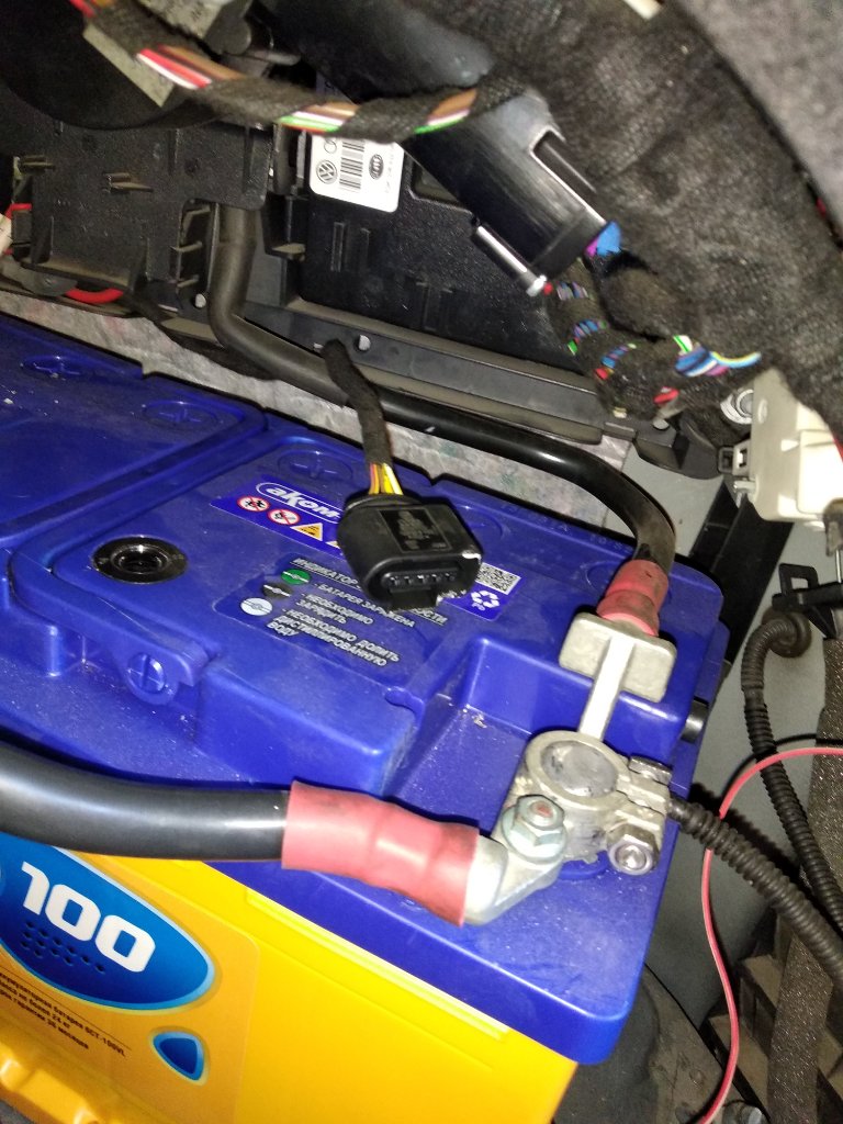 Присоедини красно-белый проводок(на фото справа) к плюсовой клемме под гайку.