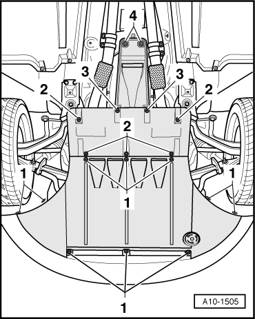 – Ослабить крепления -1-, -2- и -4- и снять шумоизоляционный экран.