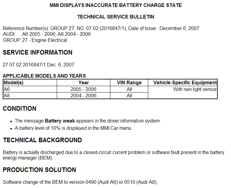 Ну решил тут проверить АКБ и если нужно провести профилактику. При включении зажигания (без заводки) на приборке так и появлялось сообщение об ошибке блока управления питанием - типа Battery Management Level, и ММИ постоянно показывал что уровень зарядки АКБ 10%.