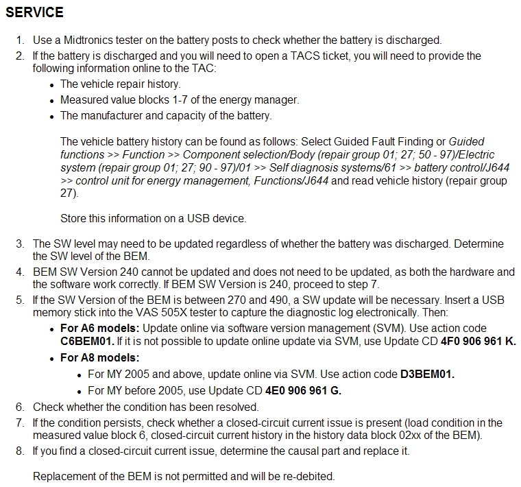 • Проверить состояние заряженности АКБ или существует ли проблема с утечкой тока покоя (состояние АКБ можно посмотреть в Блоках измеренных значений ВЕМ (канал 6), историю токов утечки можно посмотреть в Historiendaten Block 02xx des BEM).