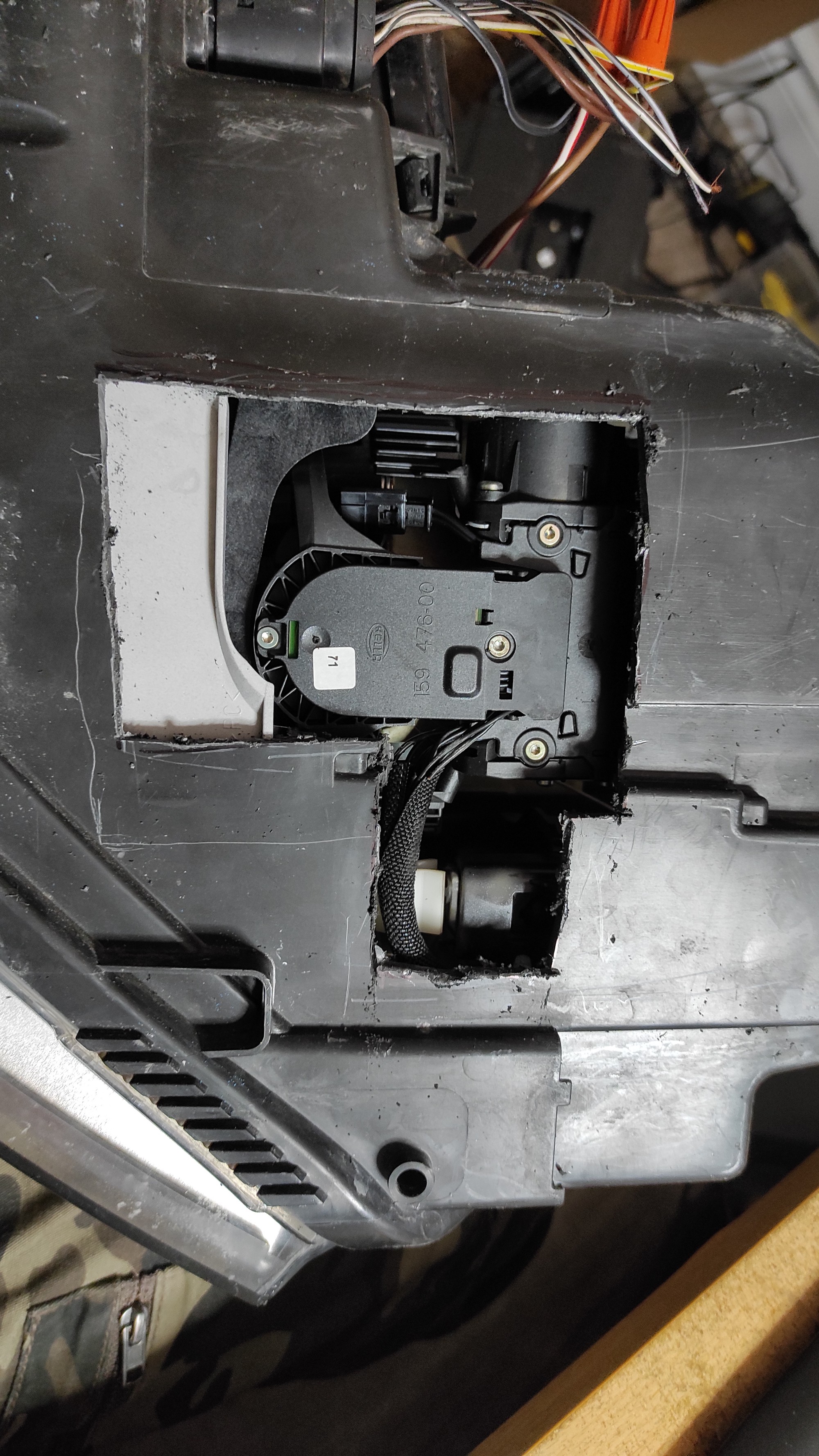 Наконец потеплело и добрался к фаре... сначала подкинул модуль со своей старой, котороую менял изза подбитого стекла. Не помогло. На старой вырезал окошко- понял что не очень удачно, так как оказывается цеплянул место крепления отражателя... немного уменьшил окошко чтобы хотя бы все разглядеть. Поэтому нормальный вырез, при котором удобно работать-на втлрой фотке... и сразу попался победитель-показан на фотке 3 и 4. Они не совсем там правильно сделали, так как датчик статичен, а вот моторчик поворотный с шторкой-на подвижной части. А они все 9 проводов в один жгут засадили- не удивительно, что ломает на сенсор... после ремонта пооводов провода на датчик оставил отдельно от других. При сборке вврезаный кусок пластика подпаял по углам и прошел алюминиевой клейкой лентой... мало ли..