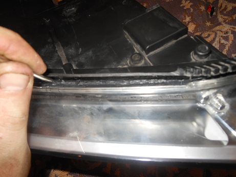 Очищаем старый герметик,наносим новыйЧто бы придавить стекло плотно,до полного высыхания герметика,я придавил фары диваном