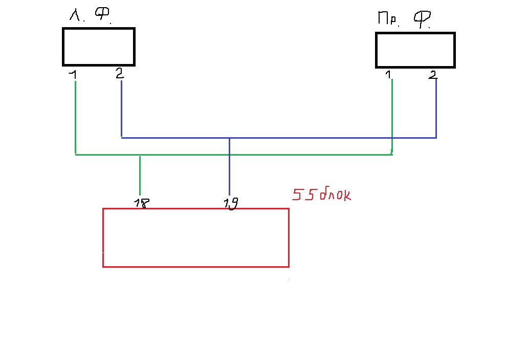 1,2,3,4 пины идут на корректор в обеих фарах на разные пины 55 блока.У тебя же и правая и левая на 19-18 а так по схеме только левая фара пин 4 в 18 и пин 2 в 19.А 3 у тебя вообще не участвует 4 на 8 тоже не понятно на постоянное питание если питание 23 на 55 блоке