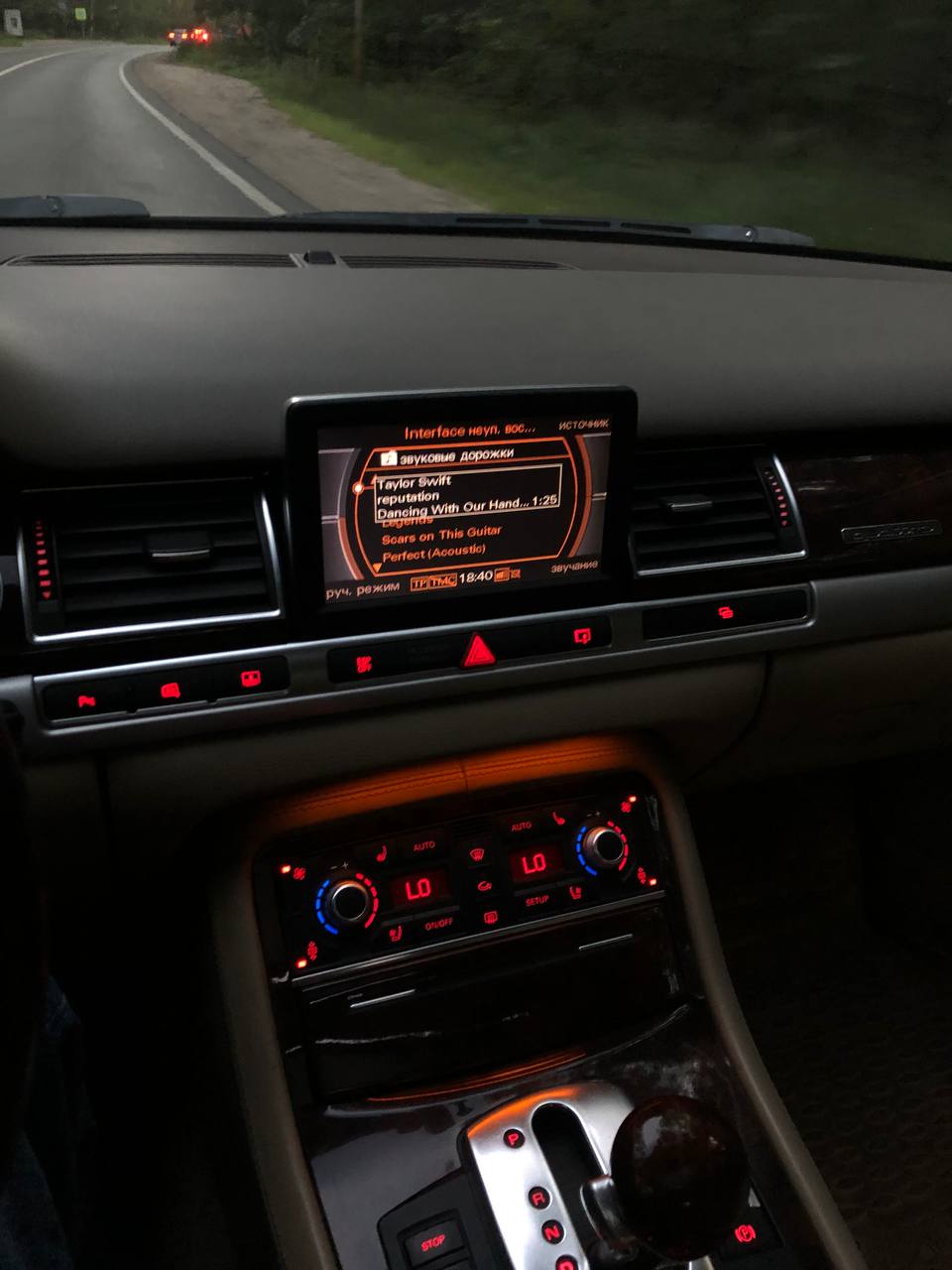 Подсветка пришла, валялась год, пыль собирала, ждала своего часа. Тут появилось свободное время и повод ею заняться. А именно доустановка сайд ассиста и перенос DVD плеера из багажника в бардачок. Все прекрасно помнят о подсветке тоннеля над климатической установкой, о которой слагают легенды. Именно она как мы помним проиллюстрирована в ELSA, но по каким-то причинам не пошла в серию. А после 2003 года её и вовсе начали запаивать. Например в автомобилях 2004 и 2005 года которые я встречал, это место запаяно наглухо, и никакого выреза и его следов там уже нет. Ну а у меня он был, причем вместе с крышкой (кстати тоже с оригинальным номером). Взял оригинальные провода с донора, флисовую ленту, прокинул проводку, сделал подсветку нужной длинны и подключил её к родной фишке сигнализации (которая находится рядом с соединением фишки карты с ЭБУ двери), у неё как раз был один свободный пин, чем я и воспользовался и запиновал его подключив туда + от контурной подсветки. Теперь подсветка центрального тоннеля полностью регулируется в настройках контурной подсветки MMI и работает синхронно с дверьми. Ну а как она выглядит, словами и фотографиями не передать. Бежевый салон и золотой цвет...идеальное сочетание. Позже постараюсь наделать фоток, но пока сделал обычную фотографию по пути домой, ехал через лес, и там как раз так хорошо притемнило. Примечательно что подсветка хорошо подходит под классическое оранжевое меню MMI 2G
