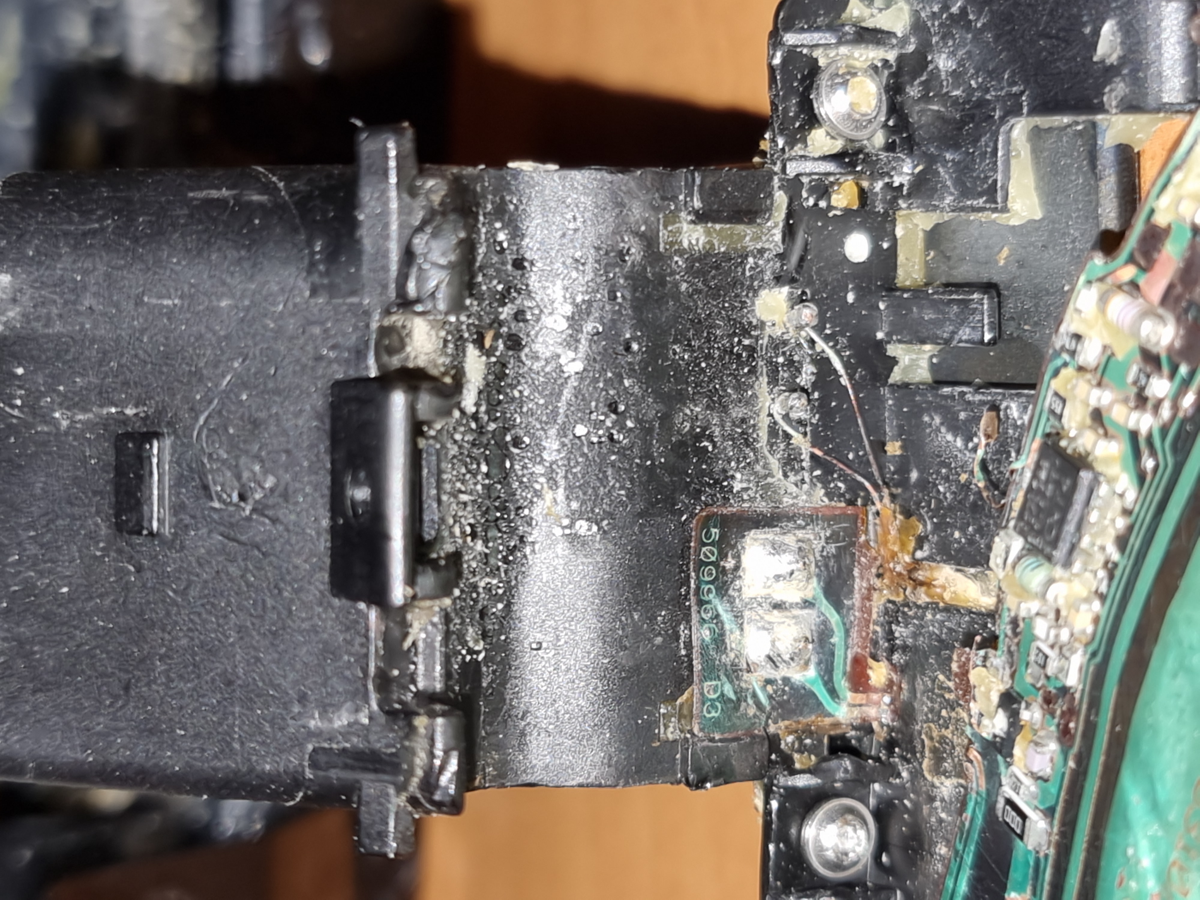 Видно и сам сенсор с электронной схемой и сама антенна намотаная на ферритовый сердечник. Внутри в районе сенсора,на плате была сырость,в кнопке была вода. На фото выглядит плата сенсора целой,но это я склеил скотчем,то что местами оторвал. Не реально,не повредив разобрать и достать это все из герметика. Хоть феном паяльной станции и размягчается герметик,но все равно хорошо держит эту фольгированную тоненькую полимерную пленку на которую нанесены проводящие дорожки. У мерседеса в ручке на текстолите собрана сенсорная часть. Там извлекается целой плата. Потом только залить по новой после восстановления.