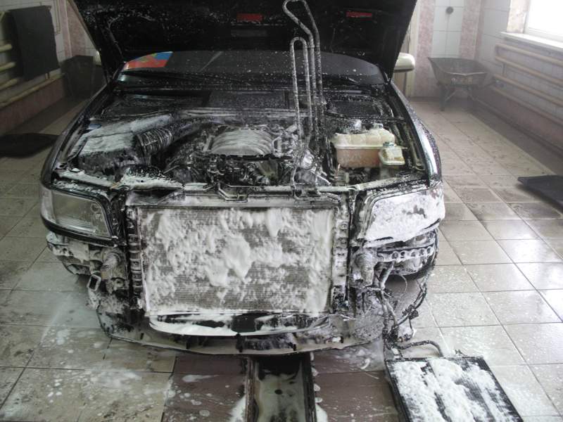 Откручиваем болты бампера, заезжаем на мойку, предупреждаем мойщиков чтобы не пугались и эффектным движением выдираем бампер :D пока мойщики отходят от шока, отсоединяем фишку, оттаскиваем бампер в сторону, откручиваем радиатор ГУРа и боковины, радиатор ГУРа задираем вверх, радиатор кондея отводим в сторону. Снимаем крышки двигателя, предупреждаем мойщиков про давление которое может создать керхер и про стоимость запчастей на А8, и даем команду на старт :))) Радиатор кондея положить на что-то, чтобы было удобно его пробивать керхером. Начинать надо как раз с него. Когда грязь из него течь перестанет - можно заливать его пеной вместе со всем остальным... Подождать сколько нужно - потом смыть... И так раза 3...