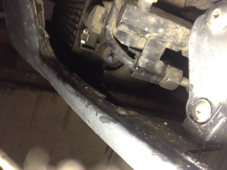 1. снимаем пластиковую защиту по днищу. слева (под водителем) видим такую картину. отсюда мы будем ловить сливающийся антифриз. шланг-ведро вам в помощь.