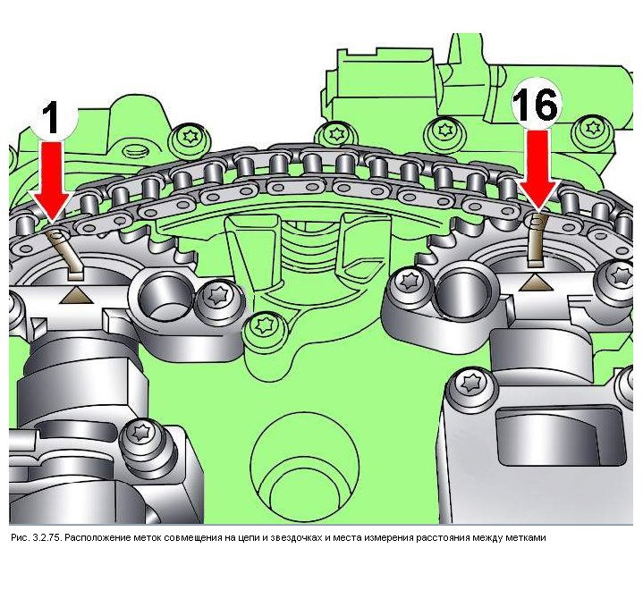 Да,на втором фото видно по краске что отметил 15 звеньев и они смотрят на стрелки на бугелях,но не вижу где метки(прорези на распредвалах.А как раз надо смотреть не на бугеля а на распредвалы.