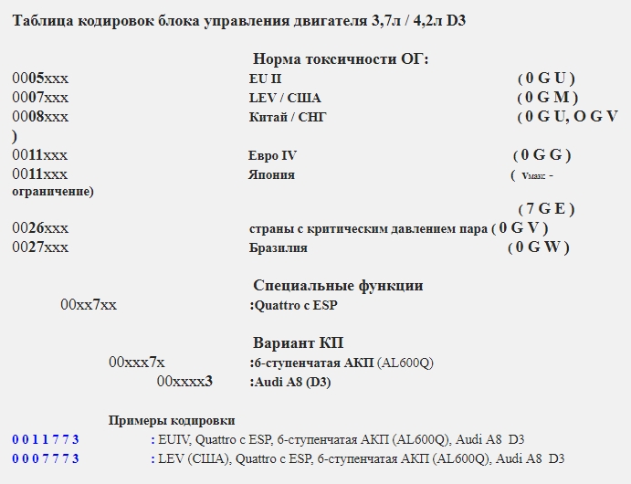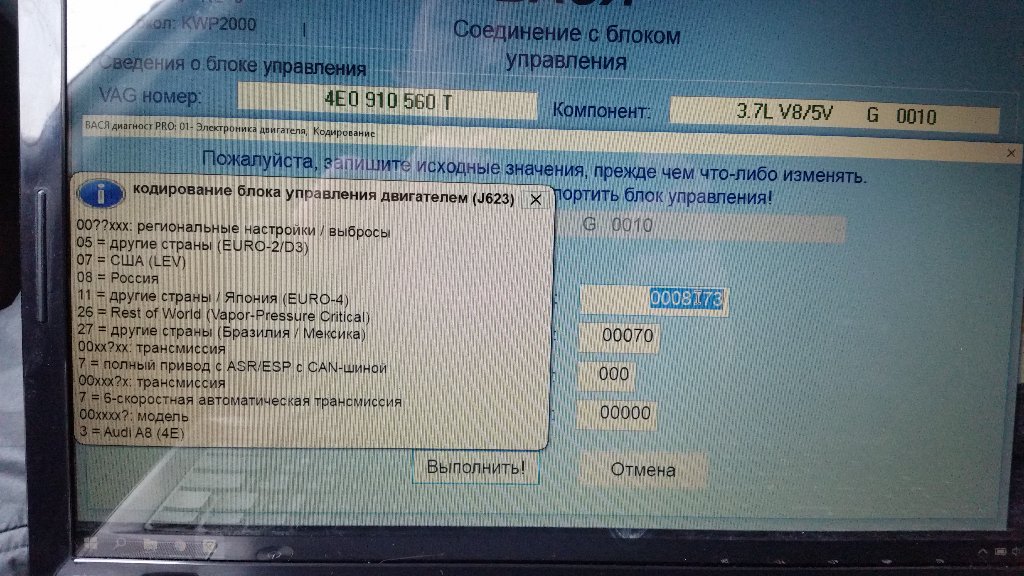 Ребята купил машину а8д3 4.2фси отключеные лямбды после катов , из выхлопа воняет бензой , расход город 33 спокойной езды трасса 10 при 120 км ч , ошибок на панэли нету , шнурка ещё не приобрёл , едет очень резво !!! Я так думаю она уже бескатовая и под евро 2 прошита и по моему некачественно , где можна посмотреть прошивку номер или название ? Прогревочные обороты есть!