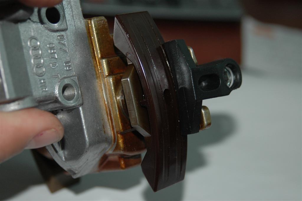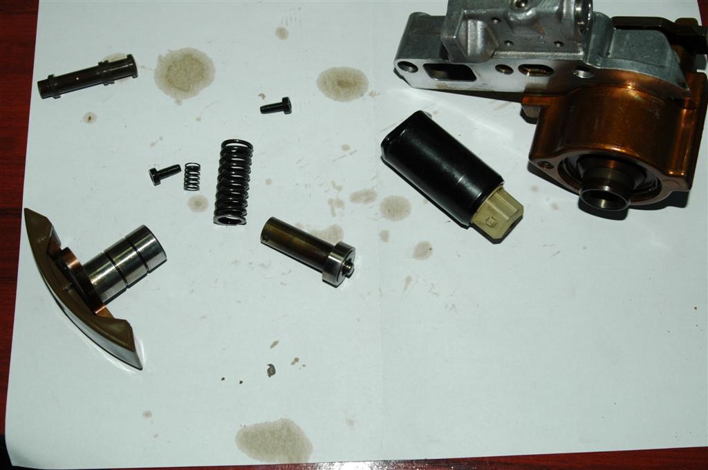 (левая голова)Поковыряв его в руках,могу предположить следущее,когда двиг не работает верхний башмак заблокирован пока не поднимается давление масла,давление поднялось стопорный палец отходит верхняя часть начинает работать.Когда нет давления масла работает нижний башмак он давит на цепь под воздействием пружины.Цепь у меня не потянулась,есть выроботка в башмаках,и порвалась сеточка(фильтр) на башмаке ее ошметки были в фазовращателе.Думаю,что делать заменить башмаки,промыть натяжитель и собрать?Или купить новый?Почему же -6 показывает вагком?Может выроботка в башмаках дает такое?Выкладываю фото.