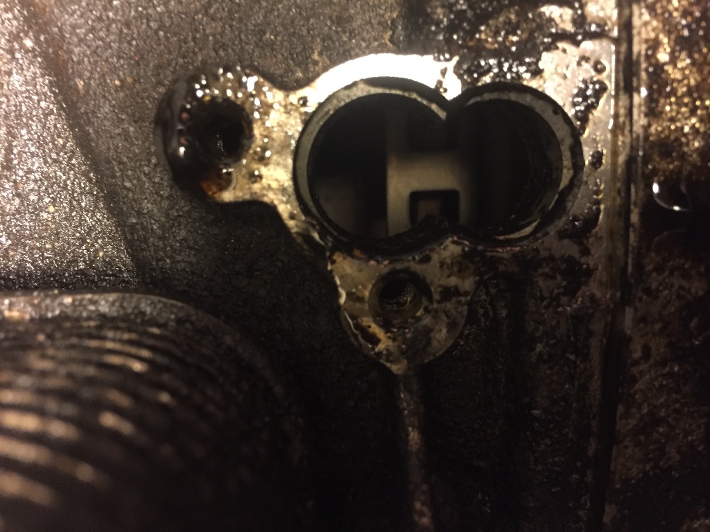 недавно купил машину (не в самом лучшем духе). Сейчас стоит в гараже, делаю пневму. Сегодня увидел под машиной течь масла, решил посмотреть и увидел там вот такое отверстие. Подскажите что там должно быть???