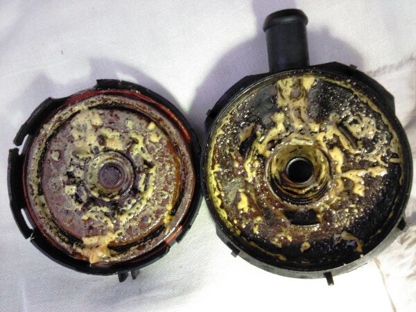 Далее разобрал грибок резинка оказалась коцаная, под неё временно заколхозил пленку, но вот что удивило, от куда в нём и шлангах маслянистая пенка и капельки воды?!