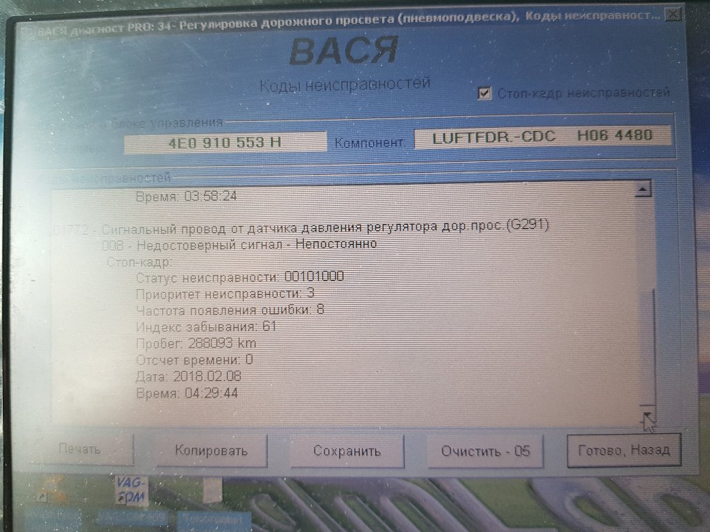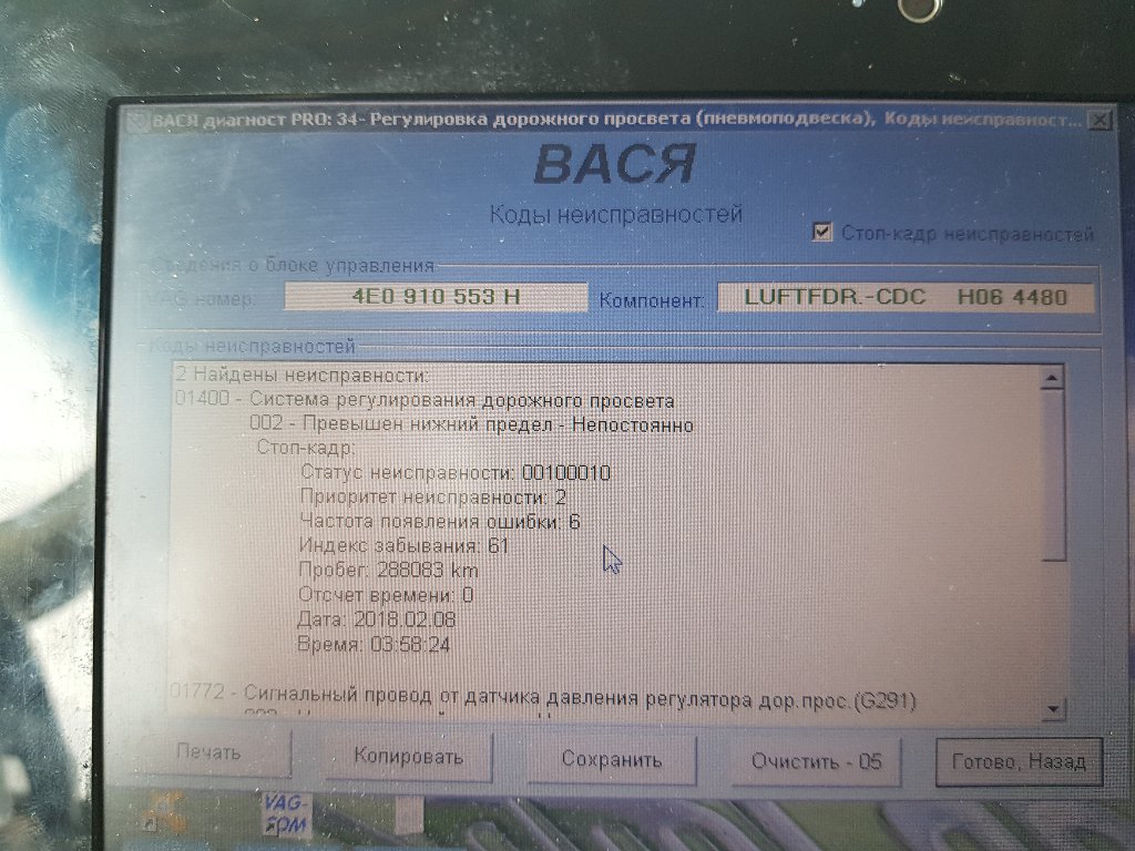 Коллеги, эти же ошибки. Но интересная ситуация, если на улице -8 и ниже, то перед падает, на правую сторону больше на 2,5 см чем левая. Если теплее то не падает вообще или припадет немного. Интересно, то что при запуске ДВС перед может подняться в течении 8-10 сек в лифт, а может и остаться как есть. Вчера так и было (t -11), завел, перед не поднялся, машинки моргали, потом зеленая потухла, осталась не моргающая желтая, пока устанавливал на другой ноутбук и настраивал VSDC, машина прогрелась, перед лежит. Перезапустил машину, загорелись обе машинки и через 8-10 сек машина в лифте. Сегодня (t-14) завел, перед поднялся за 10 сек. Доехал на работу (30 минут), по пути на 5-8 сек моргнула желтая машинка, оставил на стоянке, пока курил правая сторона упала под арку (3 см), левая тоже (1 см). В обед завел, перед не поднялся. Вечер (t-8), решил доехать до дома, машинки моргают, сначала обе, потом только зеленая.