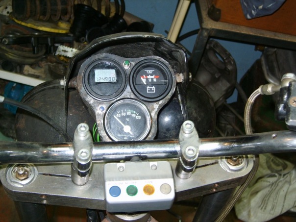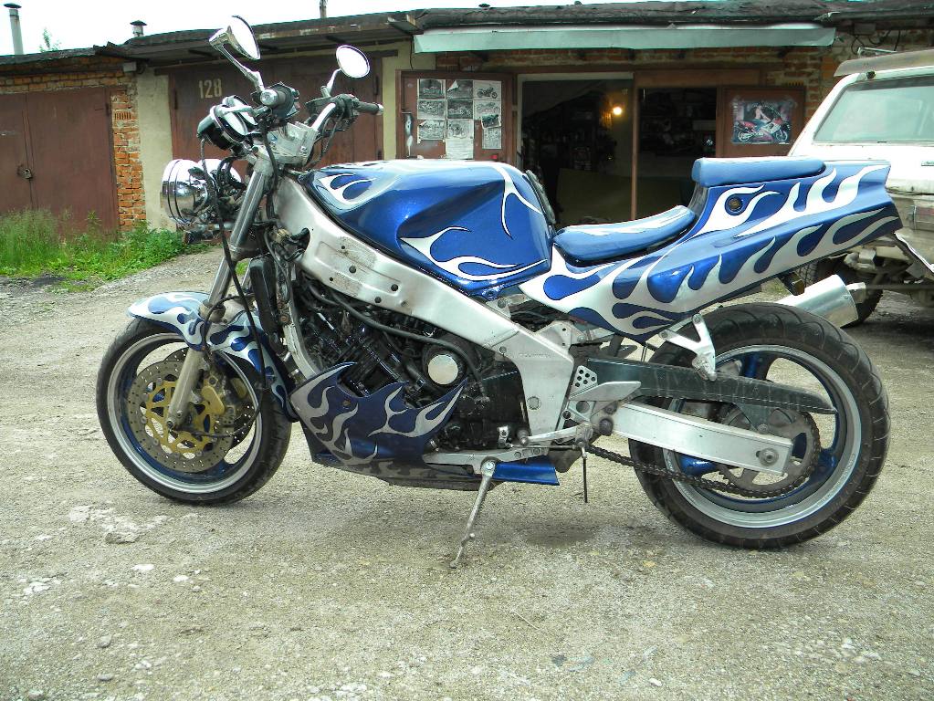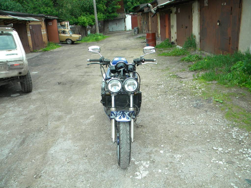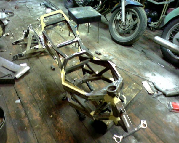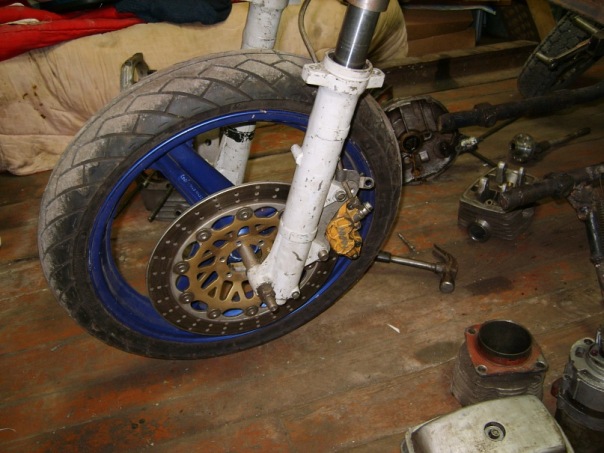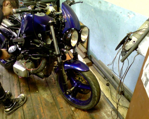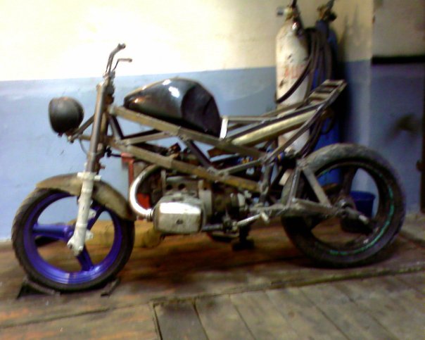 Рама –сам. птичья клетка, облегченная, двигатель «висит»,самодельная (далее сам.)рулевая колонка под конические подшипники, сам. широкие траверсы под 38 перо.сам. маятник на конических подшипниках. Сам. моноамморизатор, газовый, пружины –внешняя от Оки, внутренняя- родная, крепление через двойные сайлентблоки. Сам. оси колес. Колеса- переднее стоковое от Хонды 130 х18, заднее сваренное из двух ободов р18 от иж,с тремя спицами и разваренной по ширине ступицей Урал 180х18. Вилка передняя-орион доработанная – с пружинами отбоя и усиленными пружинами сжатия, ход уменьшен. Тормоза: перед-1 плавающий диск д 320мм,4 поршневой суппорт, главный тормозной цилиндр от «нинзя», зад – 1 диск д 270 мм, однопоршневая плавающая скоба, главный тормозной цилиндр- цилиндр сцепления от бумера. Бак сам. под потайную крышку, крылья сам. из стекловолокна, Рулевой демфер. Электрооборудование сам. частично от тазов и ямахи, приборная панель сам. из железа. Привод –кардан с двумя крестовинами, мост опилен ,9 зубовая главная передача, кпп- все ненужные отверстия заварены-4 и 3 скорость длинные. И самое интересное- дрыгатель. Кованные 3 кольцовые поршня 79 мм, объем двигателя 666 кубиков