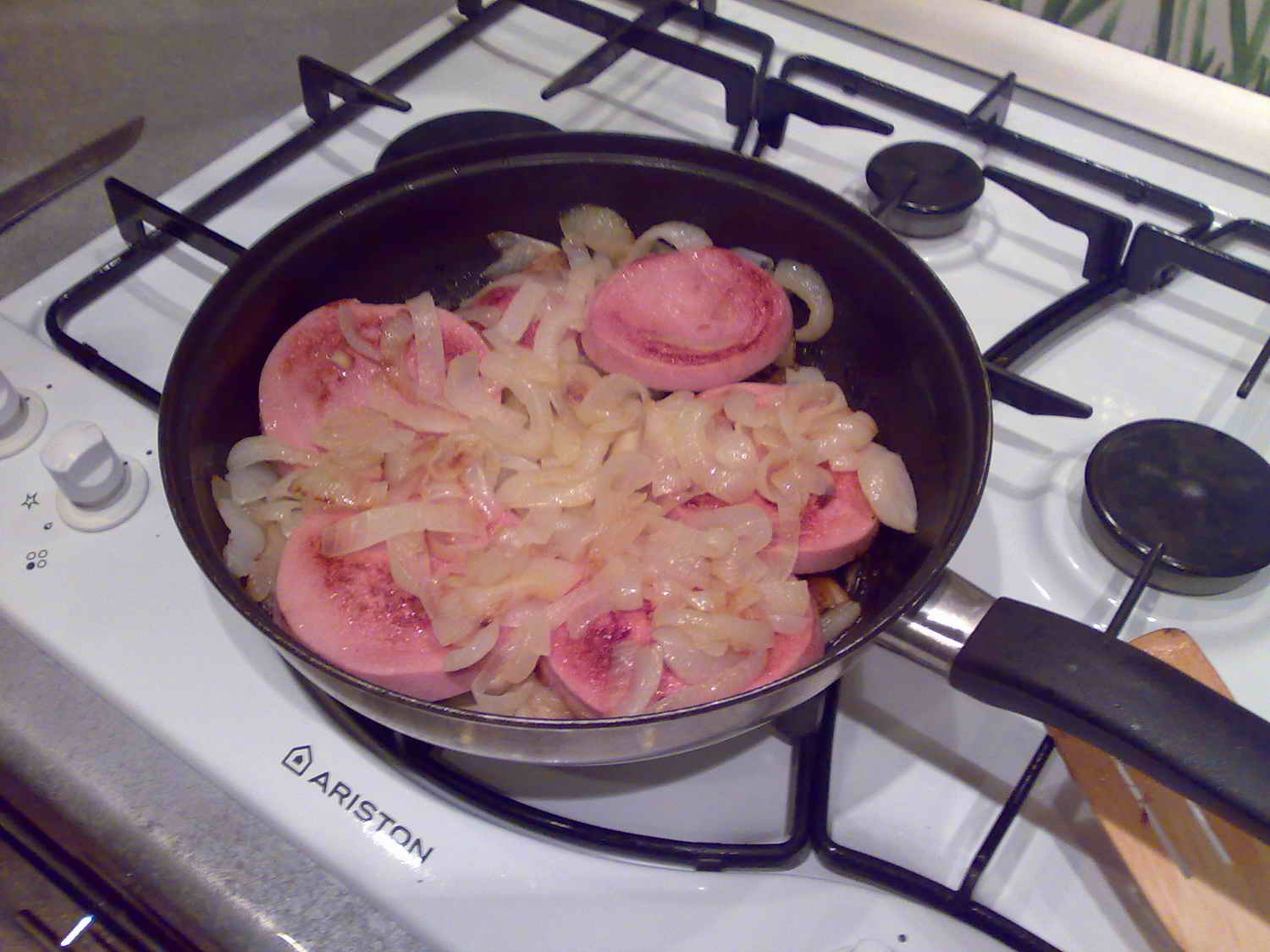 Рецепт : Режем три головки лука, обжариваем его в подс.масле до золотистого цвета ,нарезаем туда вареную колбасу "Докторскую " Жарим , что бы подрумянилась ,и основное блюдо готово.