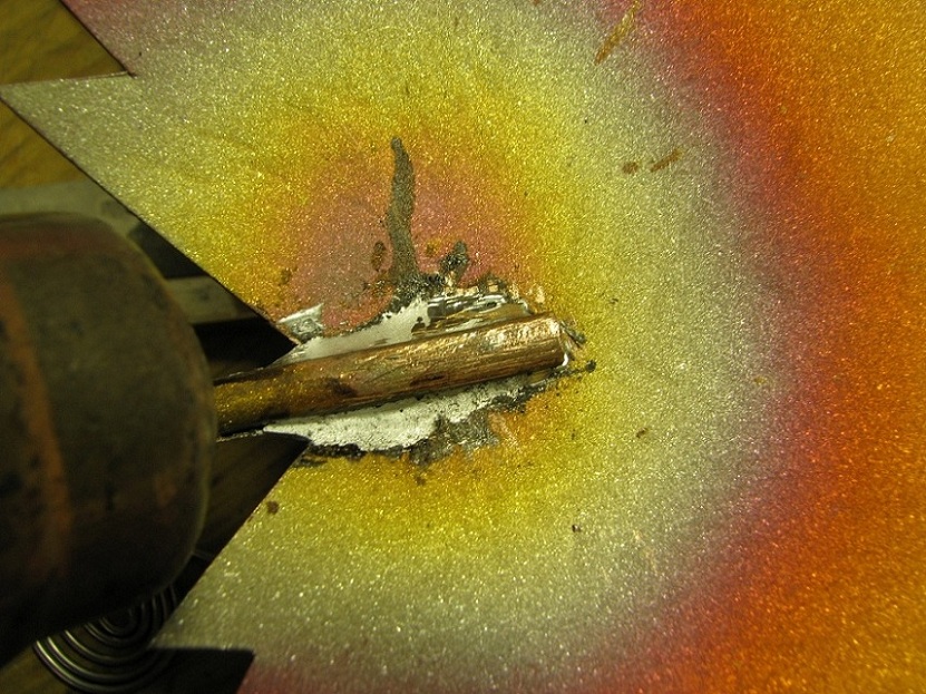 Листья после прогрева окислились и потемнели. Пескострую цветные места заново. Кстати, нужен ваш совет, оставить листья в пескоструенном виде, покрыть их лаком или искуственно состарить, чтобы они приобрели коричневато -зеленый цвет? Изначально предполагался именно 2-й вариант. На сегодня припаян один лист, завтра буду думать с флюсом для меди, нынешний плохо облуживает.