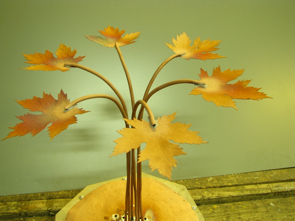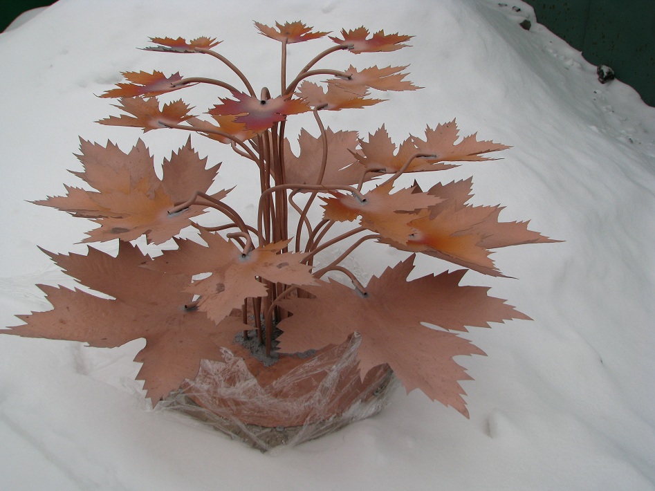 И так, начинаю посадку. В интернете нахожу картинку с кленовым листом, распечатываю на принтере в разном масштабе, примерно соответствующему имеющимся кусочкам металла. Приклеиваю бумагу на металл. Ножницами вырезаю по контуру. Долгая процедура требующая терпения. Каждые 30 минут – рождается лист. Листья еще имеют не презентабельный вид и заставляют немного усомниться в правильности выбора способа проведения ближайшего времени.