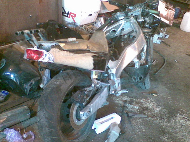 недавно начал было продавать свой снаряд, не продавался, потом, вообще поломался, по всем проверкам казался клин двига, начал продавать поломаный, в итоге решил сделать, вскрытие показало, некачественную сборку двига при переборке, голова еле притянута, все болтики как от руки закручены(что собственно и стало причинонй поломки), сняв крышку клапанов, увидел открутившийся болт(который прикручивает звездочку к распреду) который соответственно выпал, и расклинился между картером и звездочкой другого вала, что за собой потянуло разрыв цепи и загиб клапанов, снял голову, состояние цилиндров на 5+, еще даже хон видно который предыдущий хозяин делал, голову отдал на восстановление, в четверг уже должна вернуться, пока занимаемся заменой\изготовлением пластика, решили поменять внешний вид мота в более современный, фоты буду выкладывать по мере появления, пока занимаемся задней частью мота.