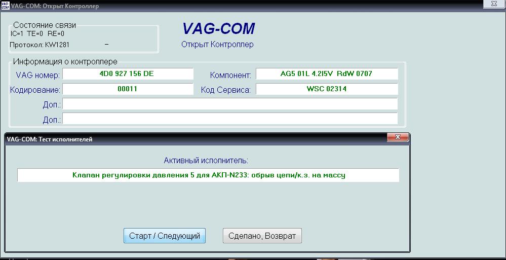сегодня тоже решил сделать тест исполнителей,ошибки те же что и выше сказанные:клапан 4 для акп-n218 обрыв цепи к.з. на массу,и клапан 5 для акп N233 обрыв цепи к.з. на массу