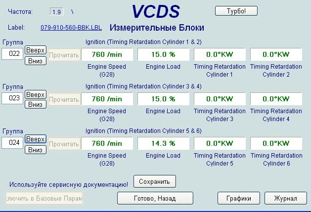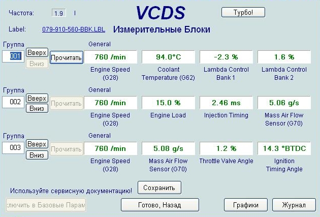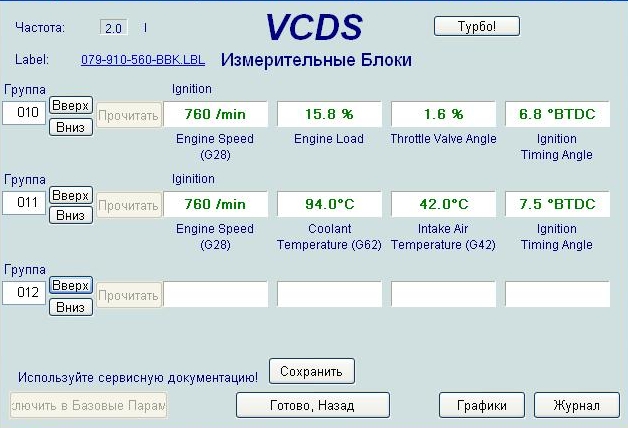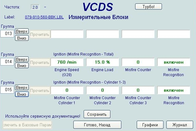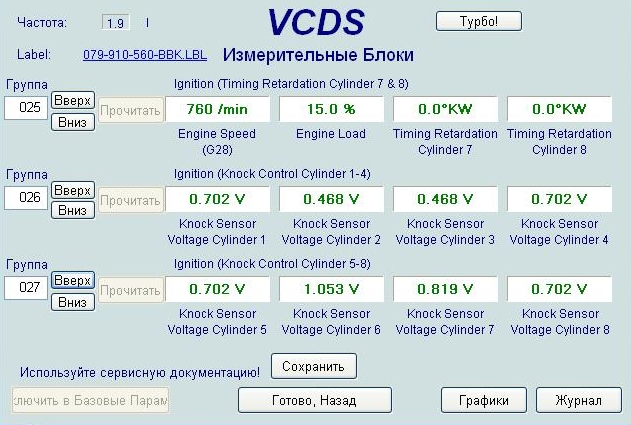 Тогда выкладывай скриншот всех каналов, на полностью прогретой машине, на паркинге и холостых.