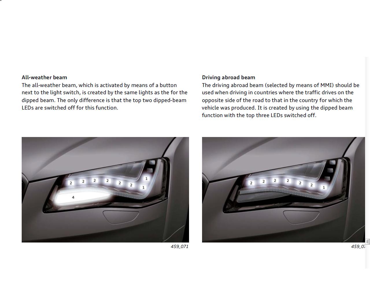 2) В ММИ есть такая настройка, только у нее несколько другая функция, к сожалению. Я сам удивился, когда осознал. Для россии она звучит так: левосторонее / правосторонее движение. И если поставить левостороннее, то она просто выключает эти 4 диода (как я и писал), оставляя ровный свет. То-есть, ММИ просто не знает, какие там галочки, правые или левые, она подразумевает, что они правильные для страны, в которой куплена машина. Но обочину и знаки хочется освещать, а потом выглядят фары тоже хуже :о)))