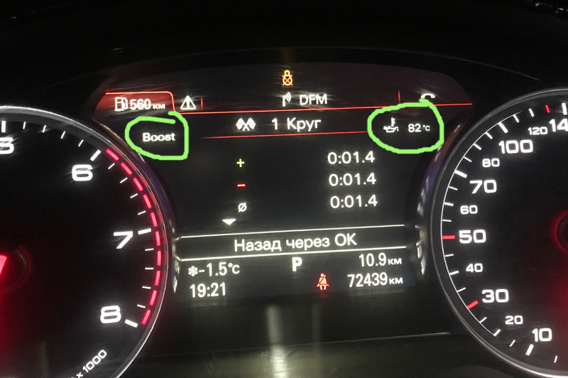 Температура масла, насколько я понял (обязательно поправьте меня, если я ошибаюсь) доступна только на экране Lap Time - специальном экране для замера спортивных показателей прохождения кольцевых трасс. Справа будет отображаться температура масла в цельсиях. На других экранах (борткомпьютер, цифровой спидометр) обнаружить его не удалось. Там же слева указан параметр "boost", т.е. наддув турбины. На холостом ходу он ничего не показывал. Как будет в движении - посмотри. Но у многих он не работает. Ну и фиг с ним.