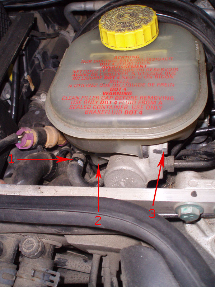 Значит, нужно для начала слить тормозуху, отсоеденив шланг 1. Я тут же на него натягивал такой же по размеру и пускал по нему жидкость в отдельную емкость, иначе она вся сольется под капот.