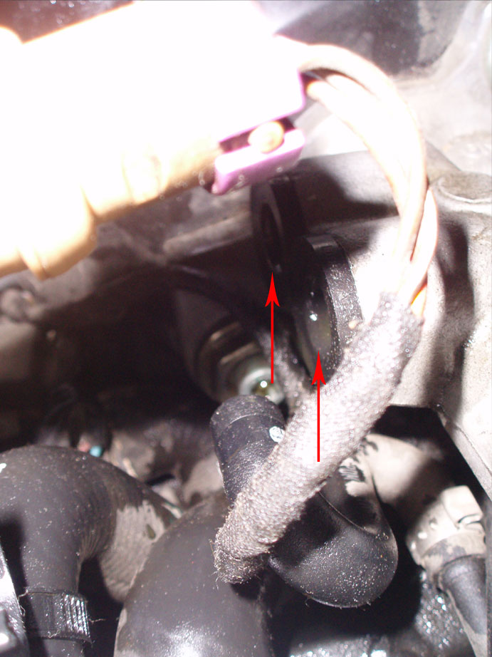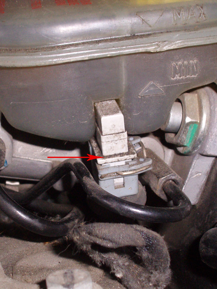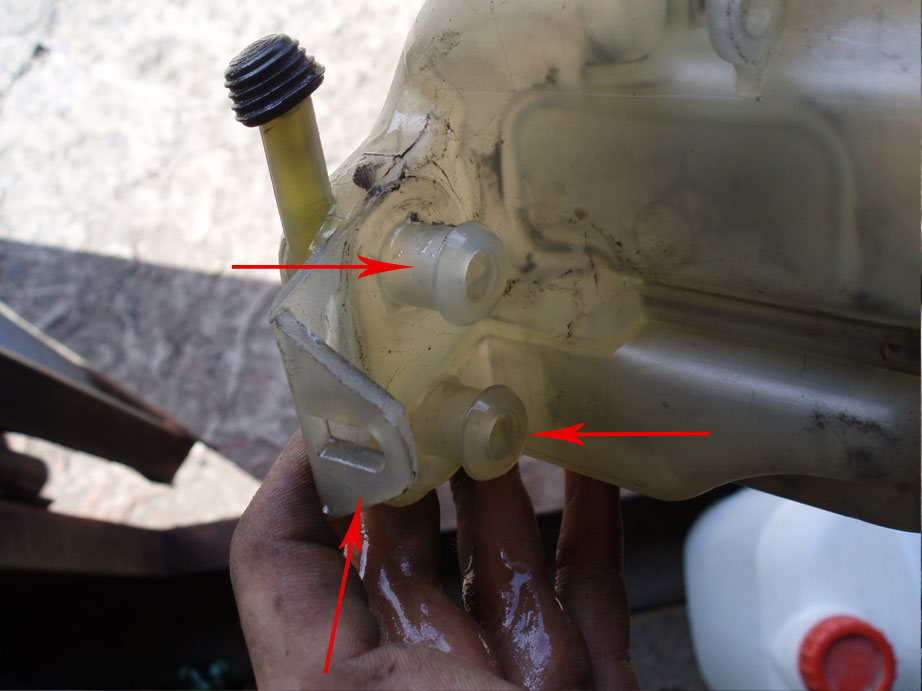 Вертикальная стрелка указывает на фиксатор, кстати, отжимал я его аккуратно отверткой. Горизонтальные стрелки показывают трубки, которые входят в главный тормозной сбоку внатяг (!) - это и есть главное неудобство. То есть приходится одной отверткой отжимать фиксатор сверху вниз, а руками или другой отвёрткой раскачивая толкать бачёк от главного тормозного, но так, чтобы не повредить резиновые уплотнители в которые входят трубки бачка.