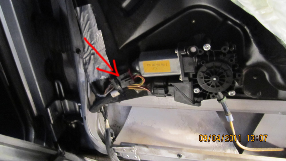 Дальше освободившийся тросик поворачиваем и вынимаем из крепления под синей стрелкой (вверх или вниз) Обшивку можно отодвинуть в сторону. (не отключая остальных проводов) Отключаем разъем к моторчику стеклоподъемника, там же и разъем на зеркало.