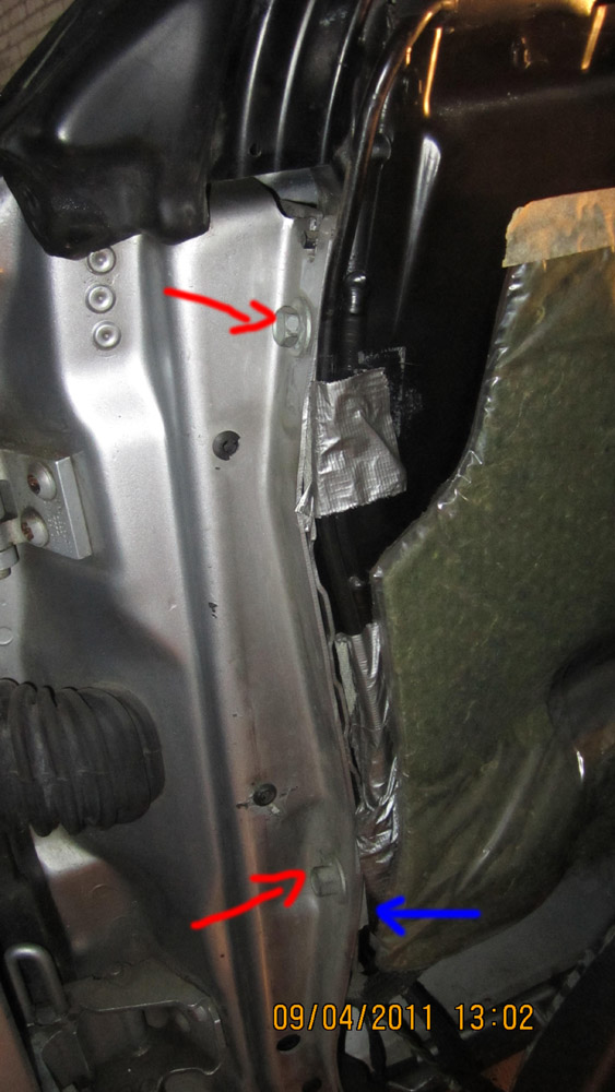 И откручиваем 2 саморезика под синей стрелочкой, чтобы снять верхнюю планку, где кнопка стеклоподъемника. Откручиваем ( торцевым ключем на 8 ) 2 болта (прячущихся в глубине). И сдергиваем обшивку с двери (аккуратно не поломав все клипсы).