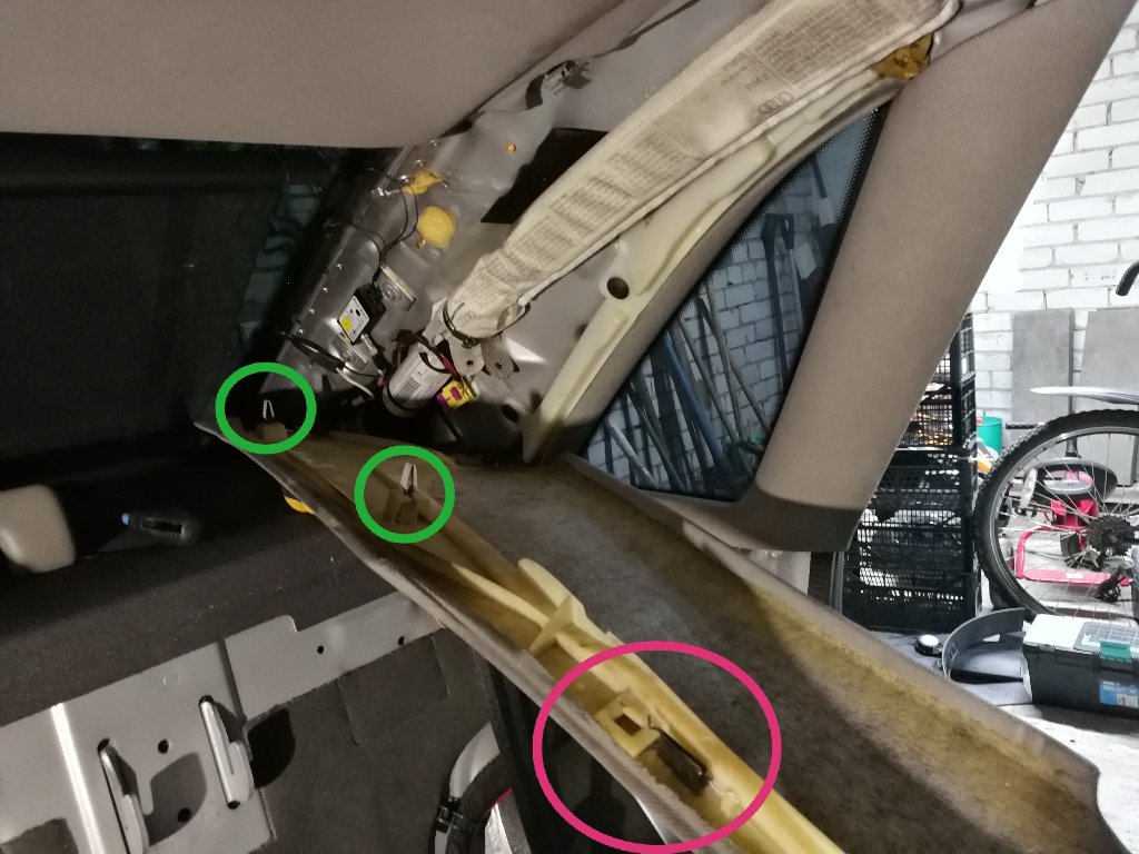Откручиваем и снимаем все ручки,крючки,козырьки,выковыриваем плафоны(откручиваем скрытые болты под ними).Под задним плафоном крыша крепится на двух мет.зажимах!!!отковыриваем их отвёрткой.И погнали