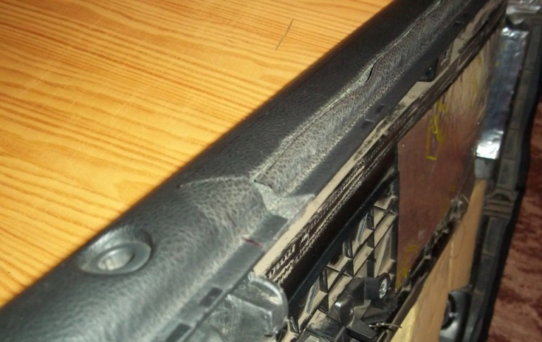 Затем отрезал лишний материал чем обтянута обшивка(дермантин), отклеил аккуратно и завернул.Закрепил при помощи малярного скотча, сделал снова разметку уже на пластике и стал пилить
