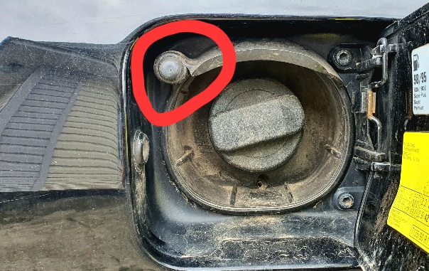 Читал, что в таком случае должна быть кнопка, при нажатии которой выходит воздух из бака и можно ещё влить бензина. Но у меня нет кнопки. Но есть козырёк резиновый над горловиной.