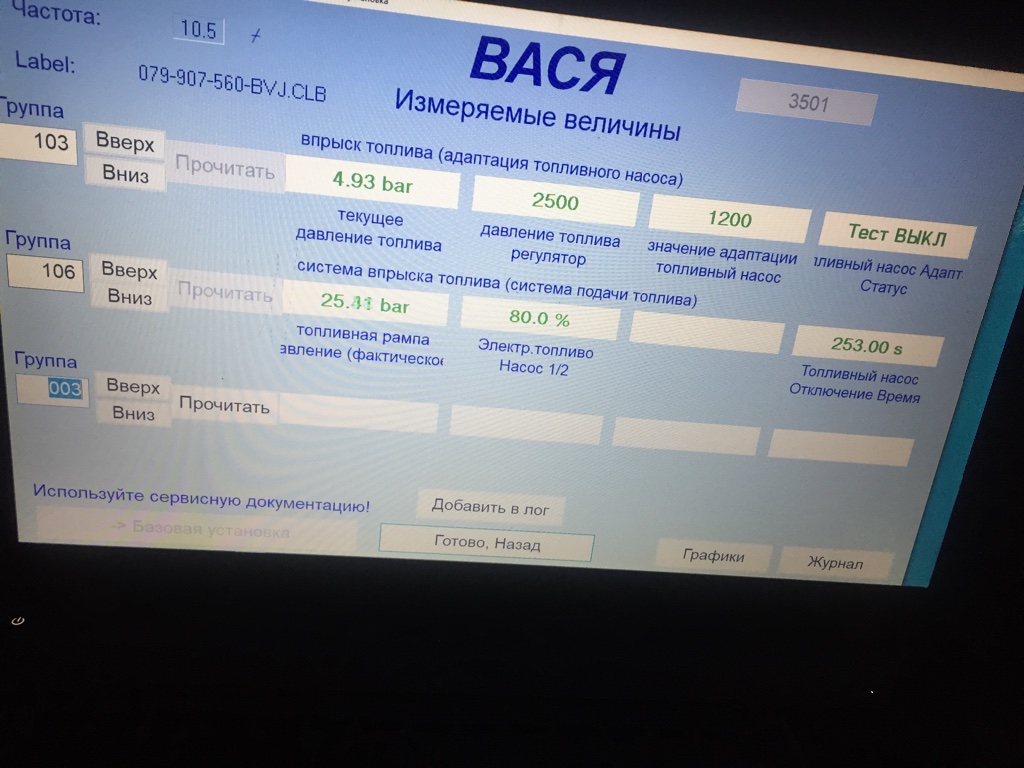 Прогрейте мотор. Затем заглушите и сразу же включите зажигание не запуская двигателя. Программа диагностики сразу же сбросит на ошибку, поэтому сразу же после включения зажигания снова прочитать блоки 103 и 106. Если в 106 блоке значение начнёт расти, то можно сделать вывод, что с форсунками всё в порядке. В противном случае - форсунки текут. В 103 блоке значение должно оставаться таким же как и на заведённом моторе.