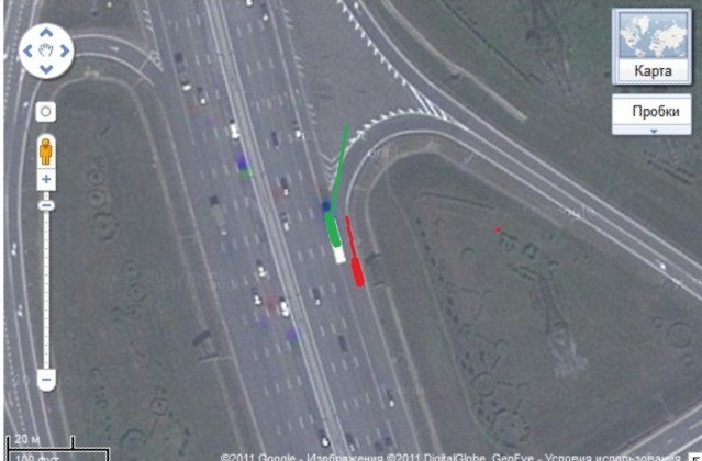 Зелёным - он. Но мои планы оборвал резко появившийся ЗИЛ, который находясь левее меня начал так же поворачивать на мост, поворотник был включён, я его хорошо запомнил, когда прям в него летел. У него скорость 20-30 км\ч.