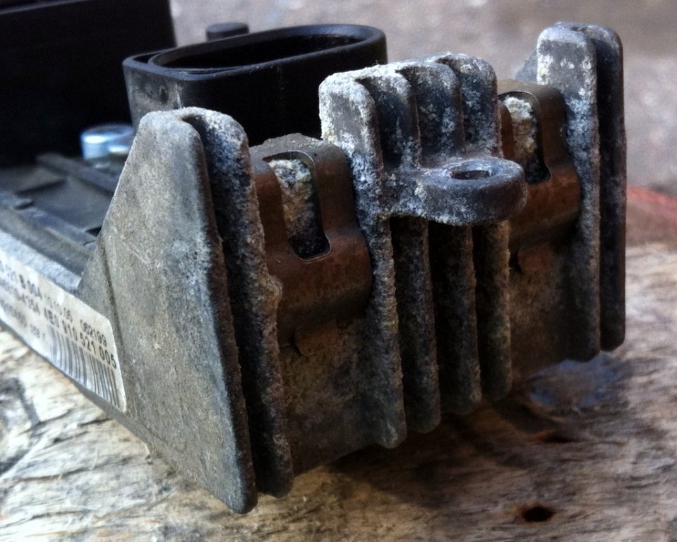 Вторая причина отказа с такой же ошибкой, выход из строя одного из транзисторов оконечного каскада блока управления вентилятором. Принимая во внимание симптомы, вполне может быть тепловой пробой при перегреве. Судя по состоянию радиатора в месте крепления транзисторов: С охлаждением там дела неважные.