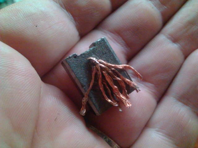 Сняв электродвигатель, вынимаем щетки, две защелкнутые блестящие пластинки, и смотрим на то что осталось: Поскольку не осталось почти ничего, первая мысль, бежать в магазин, покупать Щетки большего размера, обтачивать, ставить, припаивать выводы и радоватся жизни. Однако объездив все окрестные магазины подходящих щеток не нашел. Взвесив все за и против, приняв в расчет следующее:
