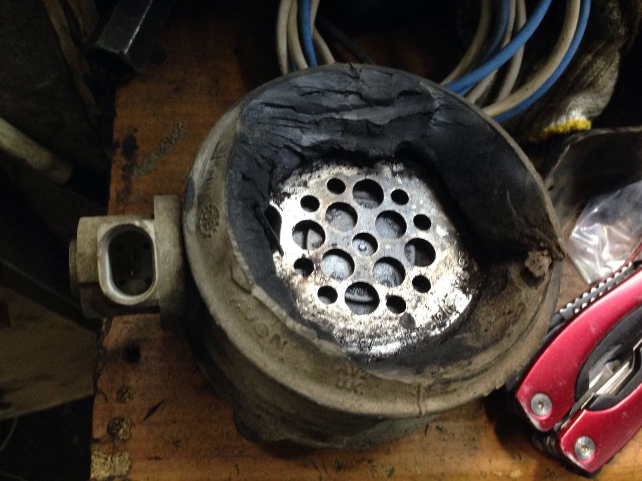 Новости. Ситуация была очень печальная. Из 5 болтов, открутились с большим скрипом, на гране срыва, только 2 передних (ближайших к нам) болта. Остальные выкручивали с помощью приваривания к болту. У самого неудобного нижнего болта пришлось выплавлять головку дуговой сваркой. После того как расплавили, болт открутился от руки. Предварительно сделали тепловой экран, чтобы защитить все вокруг. Особенно клемму и провода втягивающего на стартер. Попутно восстановили сгнивший плюсовой провод от стартера и генератора. Была повреждена оплётка провода и от влаги там была одна зелень. После снятия теплообменника - тщательно промыли. При промывке обнаружили большую кучу розовых кристалликов из антифриза (выглядит как розовая соль). Такого выбилось целая горочка. Ну и заменили самое главное, гребанную пластиковую втулку которая соединяет теплообменник (в сборе) с двигателем, она сломалась на 3 части и болталась там на соплях. Теперь она стоит из латуни, втулку предоставил Dok. За что ему отдельное спасибо. По размерам все сошлось. Попутно менялись прокладки, были использованы оригинальные, VAG. Некоторые слабые места усиливались герметиком Victor Reinz. В конце публикации приложил немного фотографии с места событий. На всю работу было потрачено около 45 часов неспешной работы без перерыва. Попутно были заменены нижние крепления фар на новые (старые были сломаны), новая подушка двигателя (после старой, порванной, сразу стало меньше вибраций свыше 1000 оборотов.