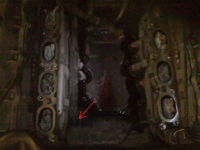 Приехал в гараж долил жидкости до максимума....Завел машину и погазовала в районе 2000 оборотов...Из под машины выдавило жидкость..лужа под движкой чуть дальше масляного поддона ... посветил фонарикам над впуск и там образовалась лужа... Снял впуск, а под ним целое озеро! Вытер всю лужу насухо...Открыл расширительный бачок и подул в него под давлением...побежал маленький ручеёк из места на фото...