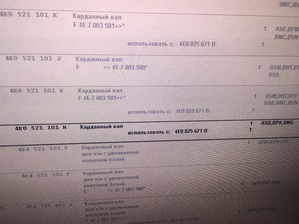 Помогите пожалуйста разобраться! По-моему VIN ETKA выдает кардан с номером 4E0521101H и указывает, что он подходит только на ASB, BPK и BNG, но на разборках везде продаются карданы с номером 4E0521101A. По ETKE подходит на ASE, BFM, BFL и BHT. Взаимозаменяемы ли они? Audi A8 D3 3.0 TDI ASB 2005 год.