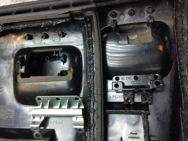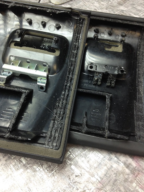 Итак...Перетянул кожей крышку бардачка вместе с торпедо и консолью. Так как ручка на купленной крышке была черная, привез и оставил мастерам свою - с алюминием и под ключ. Через 3 часа звонок: переставить не можем, крепления не подходят. Выкладываю фото расклеенных крышек с обратной стороны. Не знаю как тут на форуме их меняли, но в моем случае это практически не возможно. Пришлось перетянуть мою крышку.