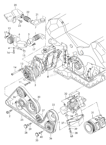 Та схема каторую вы показываете ,это от д2 ,у него не хватает маленького ролика возле генератора чуть в верх и на право(где блестит аллюминий). .У д3 нет вискомуфты ,а стоит эл. вентелятор и позиции под номером 26 нет!!!