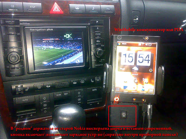 1 - Монтируем в машину зарядное устройство и аудиокабели. У меня тюльпаны из багажника выведены в маленький карман левее и ниже руля, туда же проведен главный аудиокабель (ProfiGold) - он идет сквозь панель, за Нави+, и выведен справа внизу вместе с USB кабелем от зарядника (см. фото). Так нужно, чтобы при желании пользоваться коммуникатором еще и как навигатором и автотелефоном - во многих машинах в этом месте торчит держатель от старых Nokia, я высверлил в нем дырку и привинтил современный вращающийся держатель (отсоединенный от присоски), а чуть ниже врезал кнопку, отключающую зарядник от питания (чтобы зря не сажать аккумулятор). Прокладка кабелей - единственная часть работы, где в машине требуется что-то разбирать, дальше - исключительно "поверхностные" действия