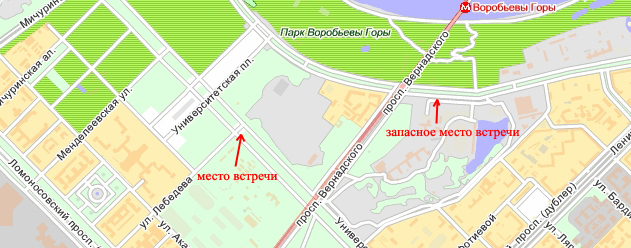 Из-за проводящихся возле главного здания МГУ соревнованиях основное место встречи может быть занято. В связи с этим, на всякий случай, назначается запасное место встречи, отмеченное на карте (поближе к ресторанчику