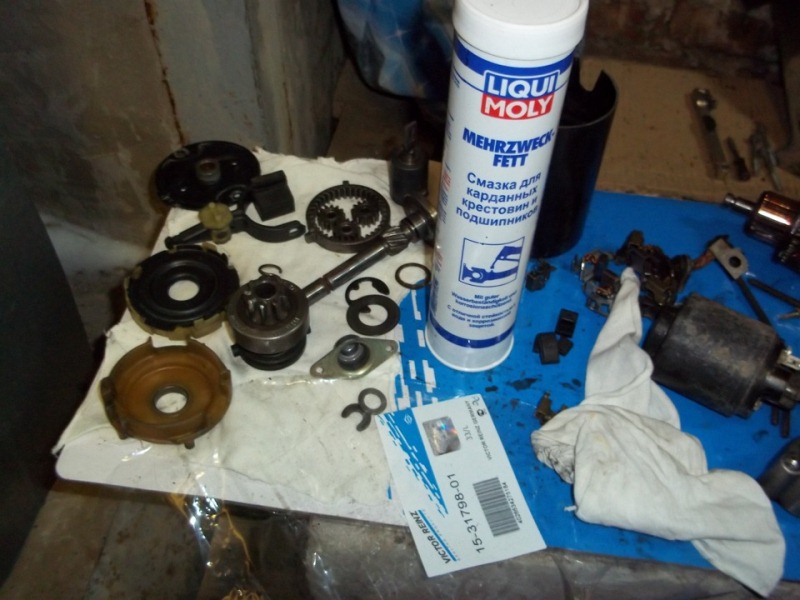 Для разбора стартера нужно открутить маленькую заднюю крышку, снять стопорную шайбу и открутить два длинных болта. Откручиваем втягивающее Далее разбираем остальное.Что бы снять бендикс с вала, нужно снять стопорное кольцо, сначала подходящей головкой сбиваем наружнее кольцо вниз и вынимаем внутренний стопор.
