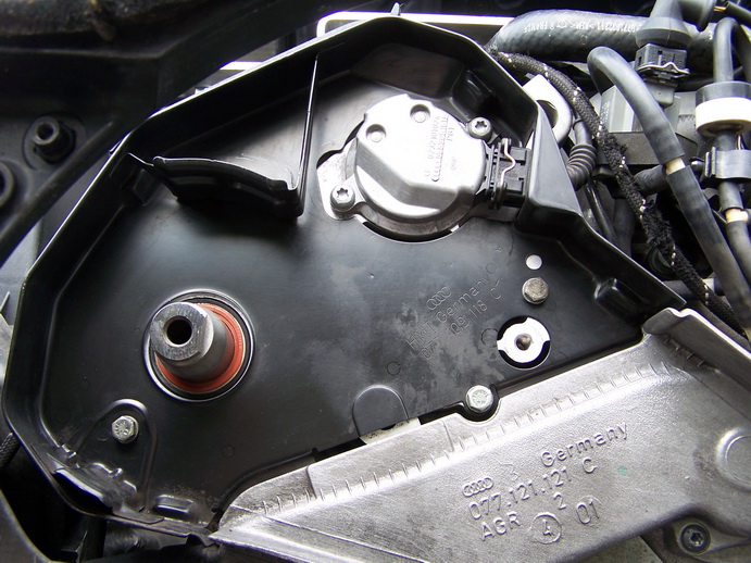 43. Установить новый ролик натяжителя и затянуть соответствующим моментом (в связи с тем что в оригинале не поставляется ролик отдельно, и по каталогам нет такого для этого мотора, то применен был ролик от SAAB 2,0-2,3-98 – натяжной ролик ремня навесного оборудования, с такими же параметрами, поэтому крышечка не устанавливается., однако вроде как можно добрать оригинальный ролик от VW с такими же параметрами)