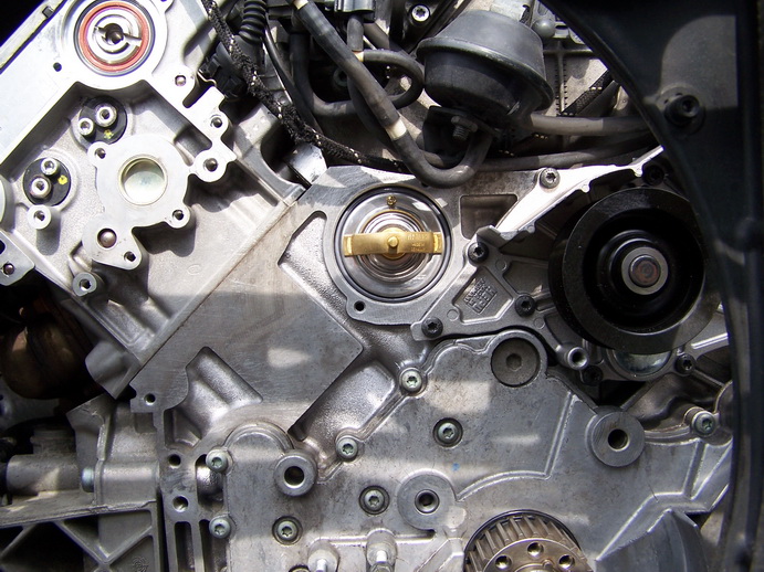 5. Установить термостат (был применен фирмы WAHLER) затянув болты крепления корпуса моментом 10 Нм. Внимание! Термостат необходимо устанавливать как видно на фото, т. е отверстием/клапаном вверх.