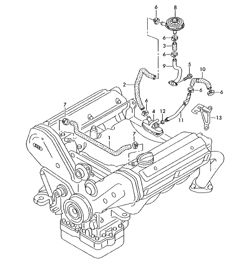 8 цилиндров, до 1999 года: 1 - патрубок 077103221E